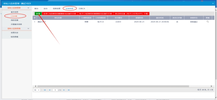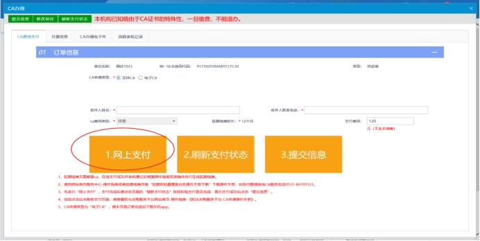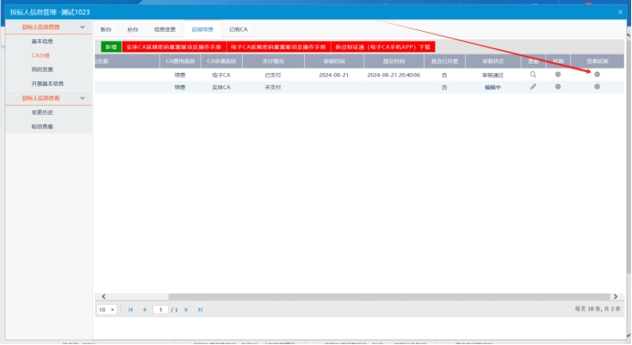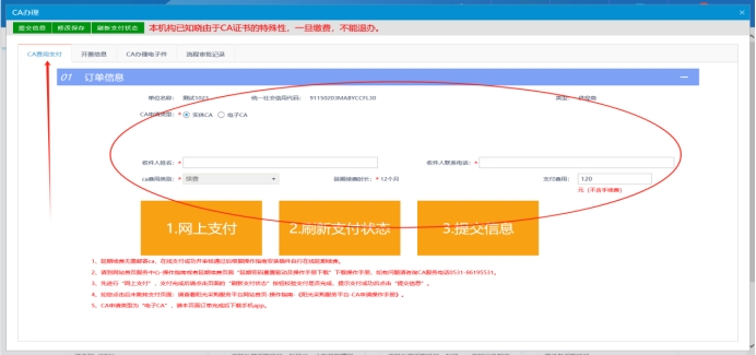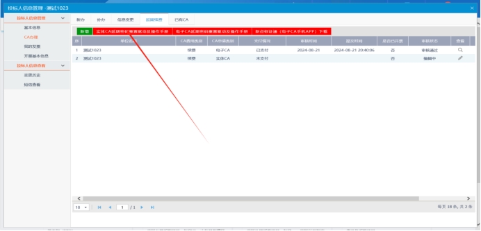 (一)首先登入系统,点击单位信息,再点击CA办理,选择延期续费,点击新增订单