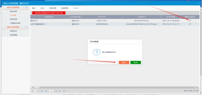 (三)回到系统页面点击 重置CA锁密码 按钮,点击确定即可