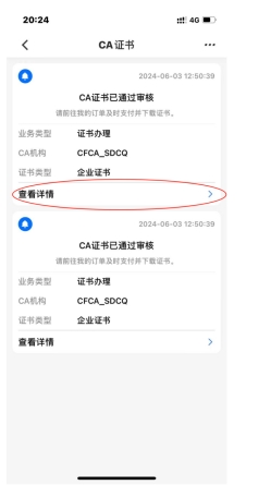 2. 此时消息页面显示CA证书已通过审核,点击查看详情