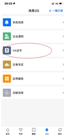 1. 首先打开手机标证通点击消息页面选择CA证书